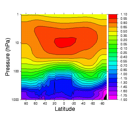 Figure 2. (b) A latitude pressure cross-section of the ozone distribution for the UGAMP data set for October. In order to be able to present the entire depth of the atmosphere on a single diagram the logarithm (base 10) is taken of the original data that was in units of parts per million by volume(ppmv). It is this log data that is plotted on the figure.