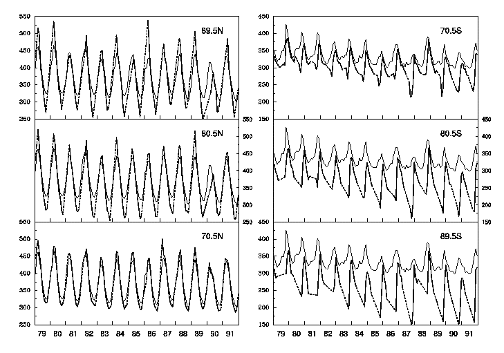 Fig. 2: Monthly series of zonal mean total O3 amount (Dobson unit or 10-3 cm-STP) at north (south) polar latitudes 89.5, 80.5 and 70.5_N (_S) during 1979-1991. Solid curves are plotted from the TOMS raw measurements while dashed segmentations are from the analyzed data. For reference, the measured series at 60.5_N (_S) are shown in each northern (southern) latitude plot.