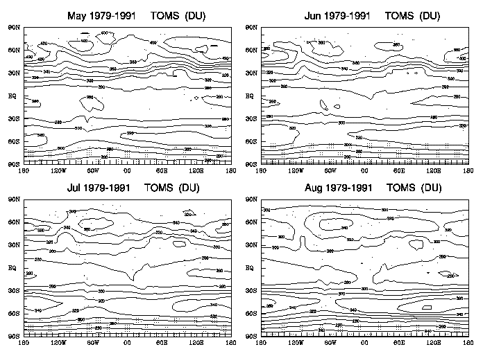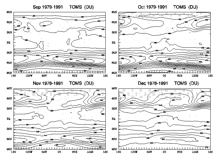 Fig. 5: Monthly mean climatological longitude-latitude distributions of total O3 amount (Dobson unit or 10-3 cm-STP) as derived from the TOMS analyzed data between November 1978 and January 1992. The contour interval is 20 units, and the shaded areas indicate where the raw measurements are missing.