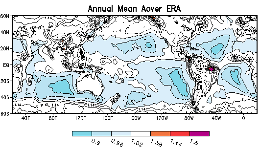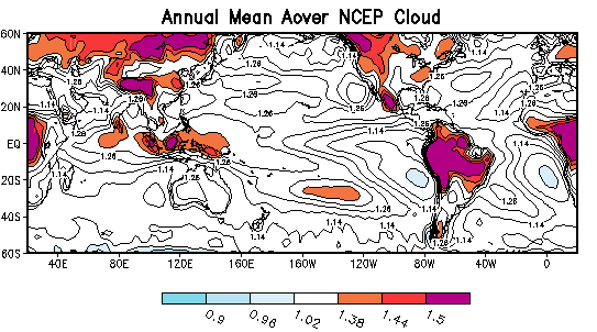 where the fI'sare the layer cloud amounts in a model or observations. When aover equals one, the overlap is the classical random overlap assumption. When aover is less than one, there is less clear sky and clouds are horizontally more dispersed than using the random assumption. aover greater than one corresponds to clouds, which are more stacked than in the random case. Figs. 1 and 2 show the annual mean aover for the ERA and NCEP reanalysis clouds. Clearly, these two estimates differ considerably from each other, implying that the two reanalyses have very different vertical cloud structures even though their total cloud amounts are similar. Thus an important comparison in AMIP II might be the aover's themselves.