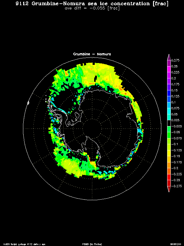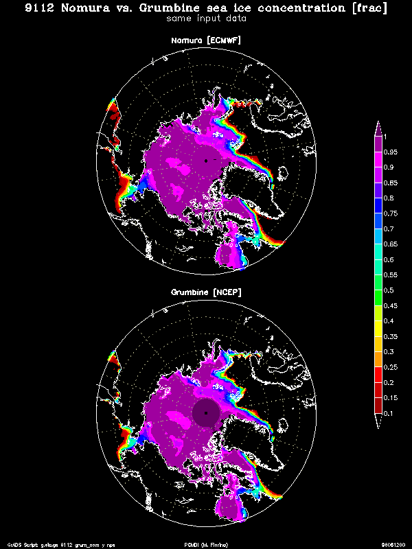 The original satellite data was on a ~25 km polar stereographic grid and was then interpolated to a lat/lon grid for use in models. Nomura applied extensive quality control of the lat/lon sea ice concentration to eliminate bad and missing data. He choose a weekly time interval to insure sufficient observations in each grid box as the SSMR sampling was less than the SSM/I. Whereas Nomura started with SIC, Grumbine uses the radiation data directly and applies quality control to both the source data and SIC product. More significantly, Grumbine performs his analysis daily.