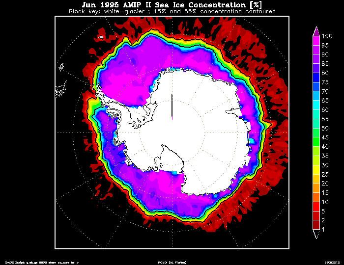Although the three SIC source data sets have different sampling frequencies and horizontal resolution, these data sets are all based on passive microwave observations from the SSMR and SSM/I instruments aboard the Nimbus 7 and DMSP satellites. Further, they use a common algorithm to convert the radiation to sea ice concentration.The two basic data sets are identified by their creators A. Nomura (JMA and ECMWF, see [Nomura, 1995 #32]) and R. Grumbine (NCEP, see [Grumbine, 1996 #34]) and the final data set for AMIP II will be called "AMIP II." For the Grumbine sea ice, the documentation may be found in (http://polar.ncep.noaa.gov/seaice/icegroup.html). Also, click here for an excellent starting point on sea ice.