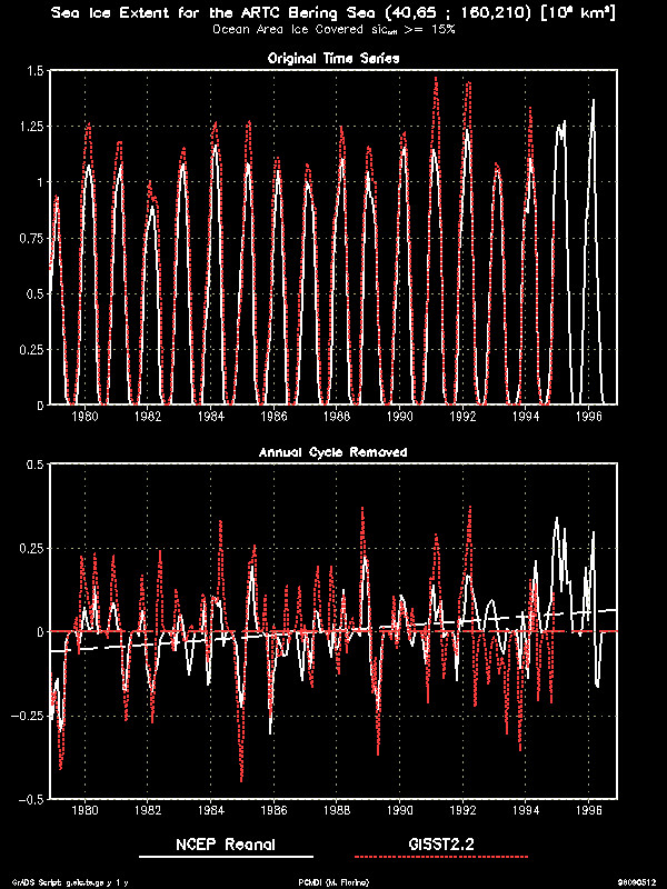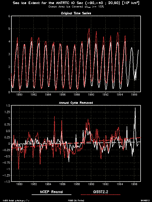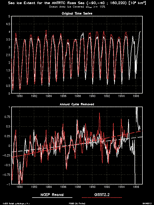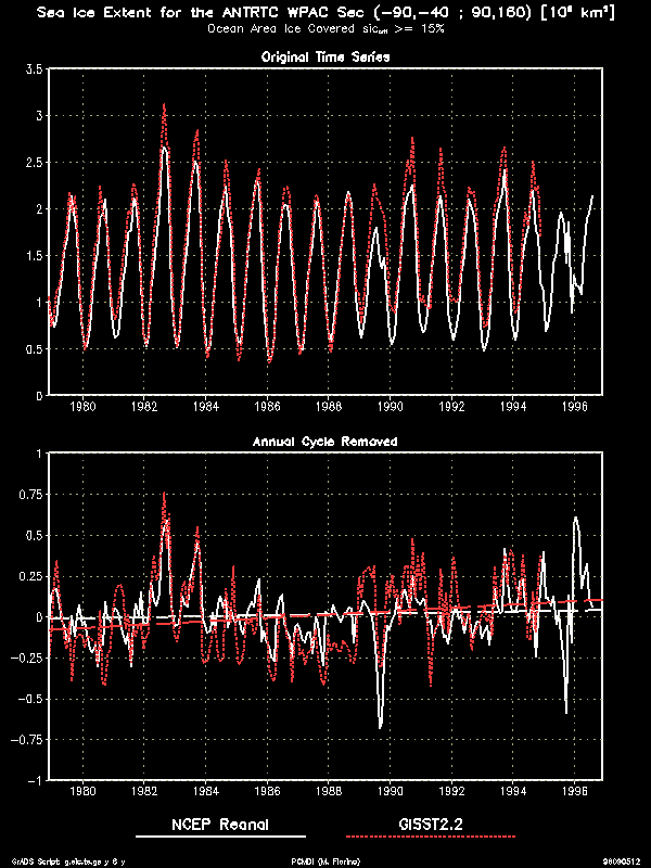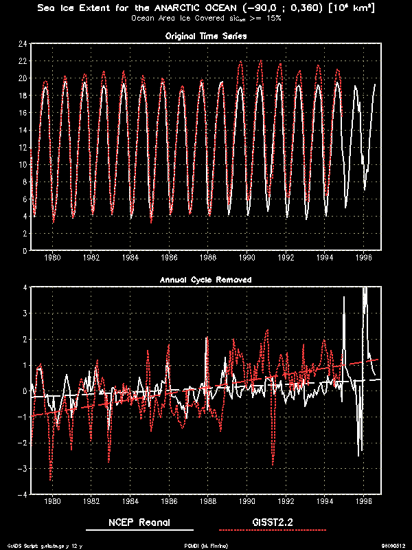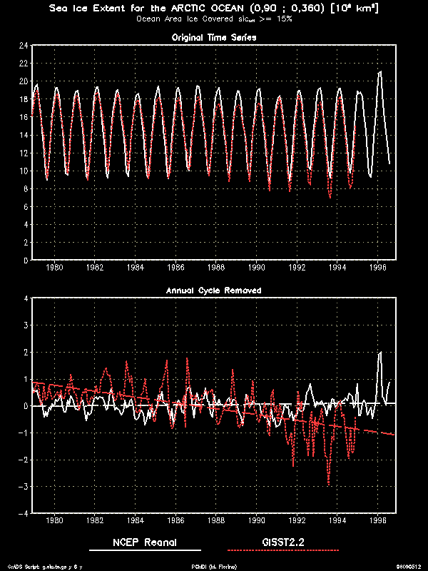 An interesting technical feature of the data were infrequent, large areas of very low SIC (2% and lower) in both sets, e.g., December, 1990 (Nomura) and June, 1995 (Grumbine). For models that use SIC instead of a mask and that might respond to very low values, a check would be needed. I did not filter these points out because they could be realistic in the ice margins and in the regions of low ice concentration near the Ross Ice Shelf as seen in the 17-year mean for February (summer time). Further, such a filter algorithm is not grossly obvious and might not be necessarily appropriate for all models.To detect trends and temporal consistency we examine the sea ice extent calculated in a similar way as in the Gloersen et al. 1992 NASA SSMR sea ice atlas. Because of different land/sea masks and crude area definition there are differences between the AMIP II sea ice extent and that in the NASA atlas. However, comparing the Arctic time series to that on p. 114 of the atlas, we see excellent agreement in the low ice months but about 15 % greater extent in the winter. This difference is mostly a consequence of the mask (I have few land points). Because we need data at all points for interpolation to the model grids, this discrepancy is considered acceptable. The key point is that character of the time series is similar and no untoward trends are found in the AMIP II data. In contrast, the GISST2.2a data shows a serious negative trend.