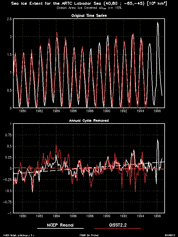 | Labador Sea (Arctic) | Substantial, ENSO-like interannual variation in both data sets, positive trend in AMIP II ice |