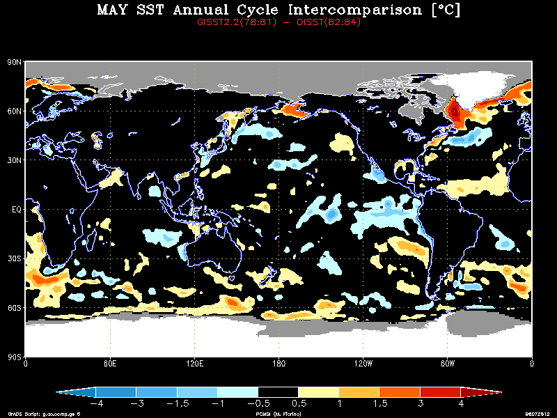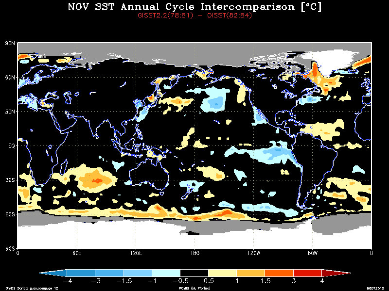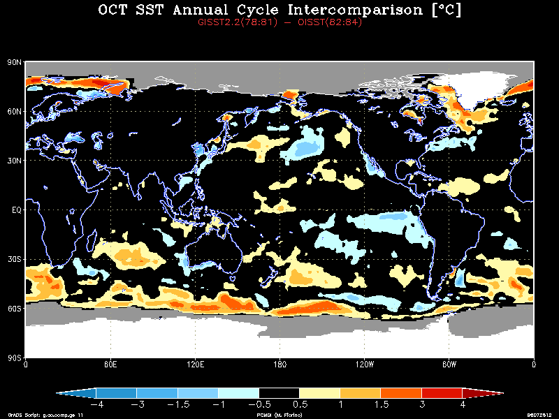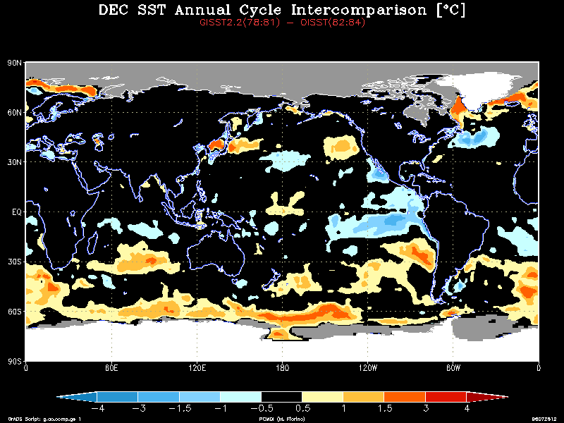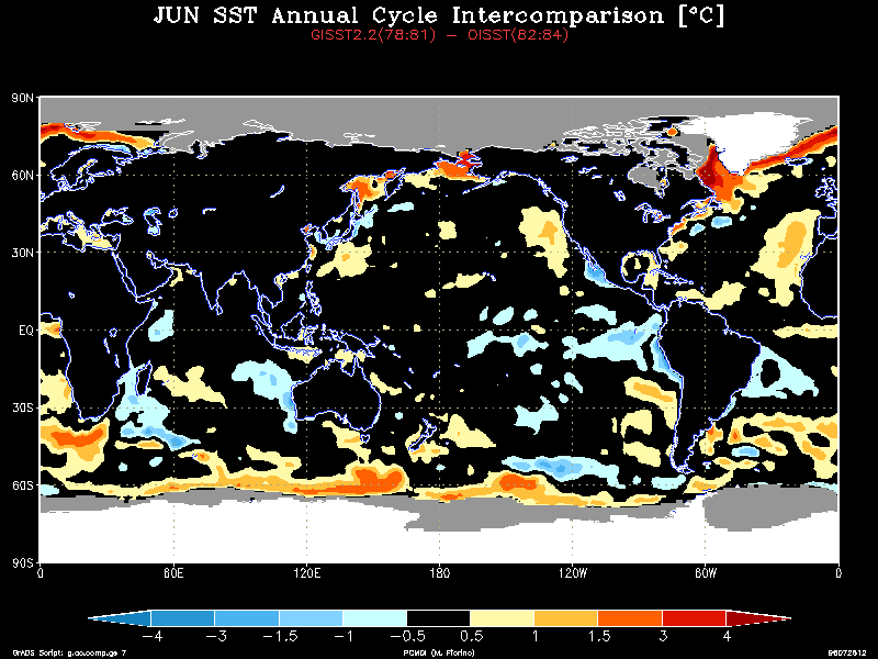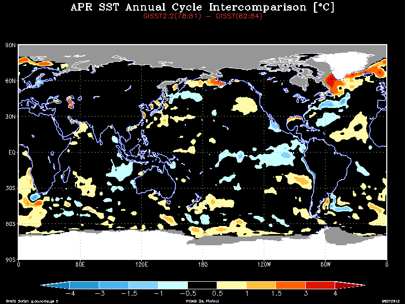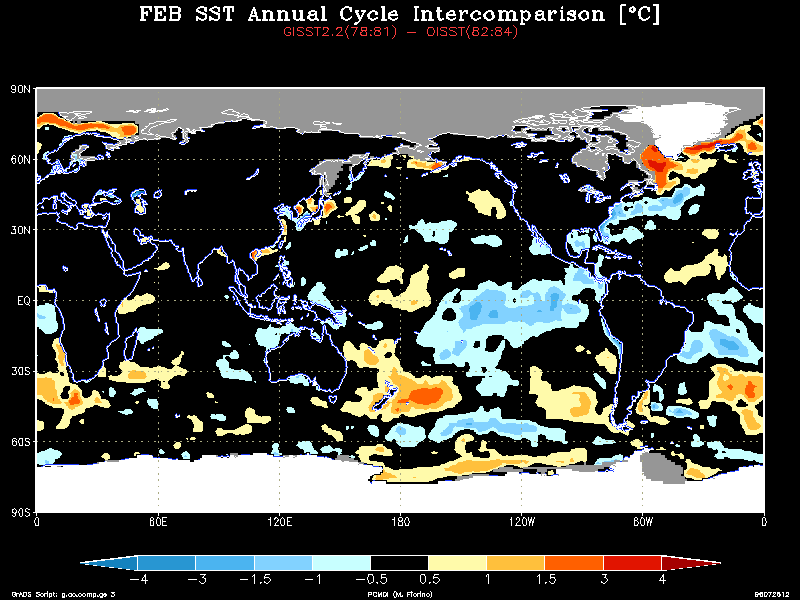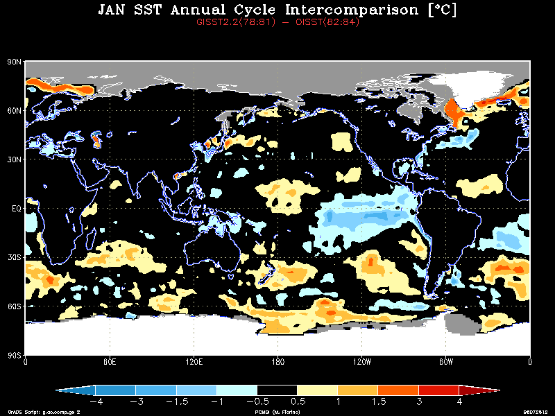 The GISST2.2a and OISST data treat the water temperature in the sea ice zones very differently. GISST2.2a sets the SST in the SIC > 0 region using an empirical relationship based on observations. In contrast, the OISST sets the SST to a constant on the sea ice mask (SIC > 50 % not 55 % as in ERA) zone and the analysis procedure defines the SST in the marginal ice zones (0 < SIC < 50 %). Thus, the SST could conflict not only from differences in SIC, but in how the SST was treated in the ice margins and a serious difference was uncovered. Examining the zonally averaged SST with the annual cycle removed shows anomalous warm water in the marginal sea ice regions around 80 N and 70S only during the GISST2.2a time.The annual cycle (AC) was then calculated for the three-year period before (GISST2.2a AC) and after (OISST AC) the change to OISST. The difference field is striking, e.g., see the January field. While there is a real change in the AC in the tropics and midlatitude oceans, a persistent warm bias was found in the high latitude ice margin. Use the table below to view a particular month: