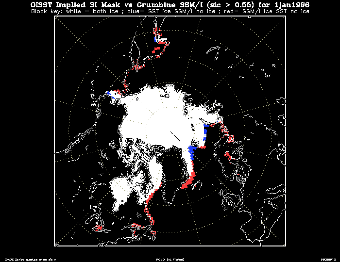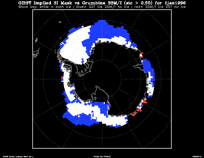 Both the GISST2.2a and OISST data sets contained internal sea ice masks (SST ~ -1.8 C) derived from different sources. Furthermore, these internal masks differed from that in the Nomura/Grumbine SIC. Thus, the SST and SIC used in reanalysis could conflict. For example, the OISST might have a point which is sea ice (-1.8 C) but the SIC data has the point as open ocean. Conversely, the SIC might define a point as being ice, but the SST would be warmer than the sea ice temperature.The problem is illustrated for the daily analyses of 1 January, 1996. The white boxes show where the original SIC and SST data were defined as sea ice using 0.55 as the threshold value for the mask. The blue boxes show where the SIC analysis defines open ocean but the OISST is sea ice, and the red boxes where the OISST is open ocean and the SIC analysis indicates sea ice. The greatest areal extent of the conflicts occur in the southern ocean although the difference in SST between the original and purified SST analysis is not large. In the Arctic, we find more unfrozen points in the OISST where the SSTs are considerably warmer that sea ice.