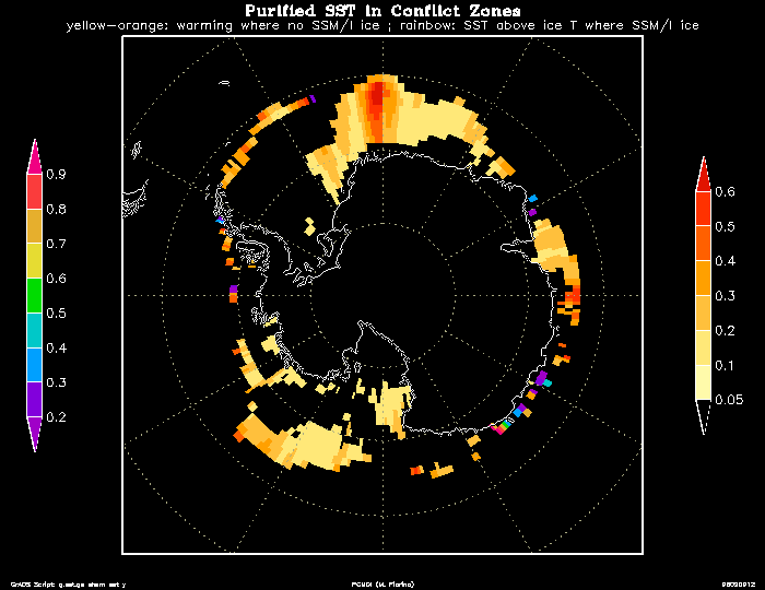 To reduce such conflicts the original daily OISST were adjusted in the internal sea ice margins to be reflective of an ocean-only analysis. This "purification" process works as follows:
