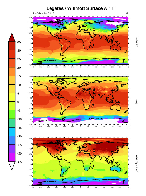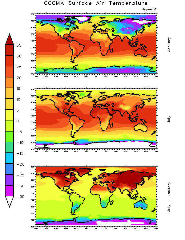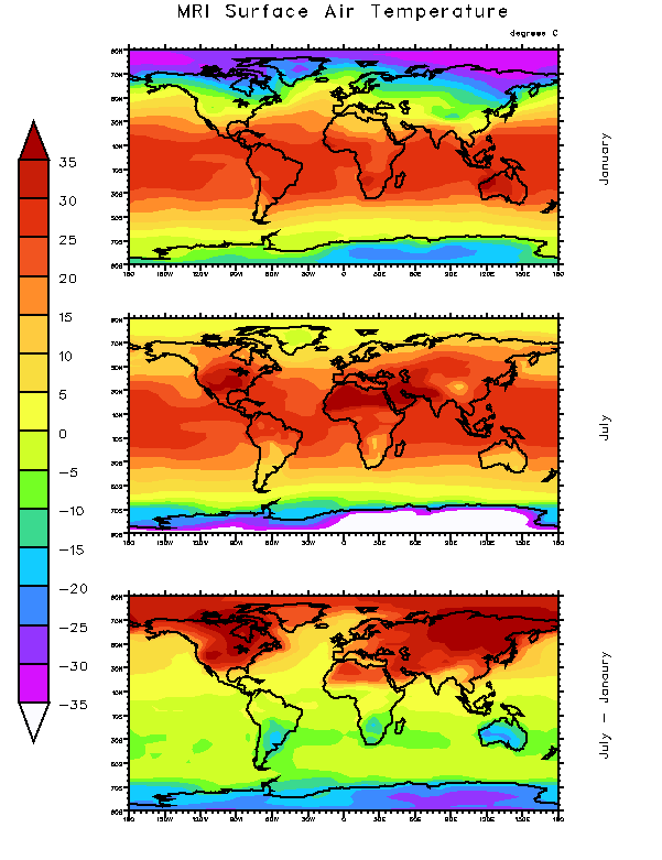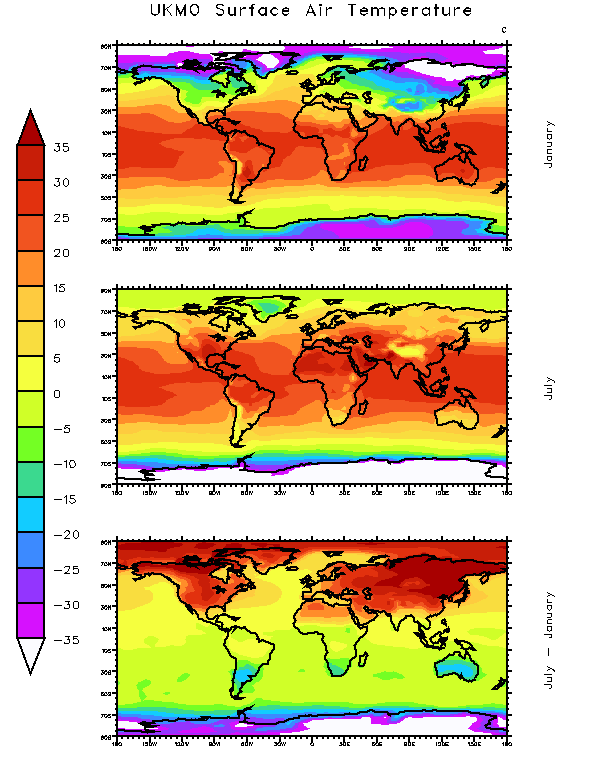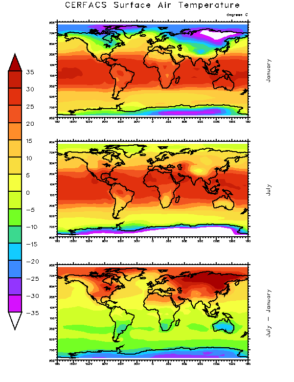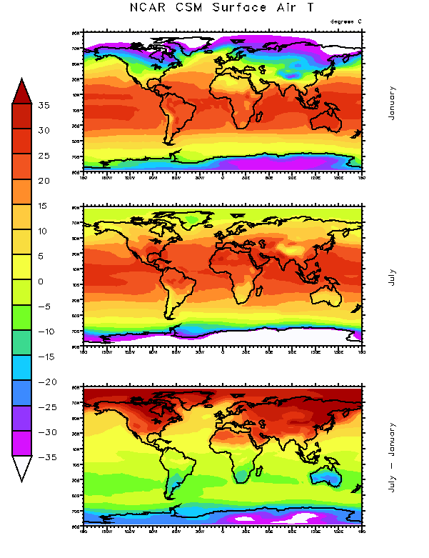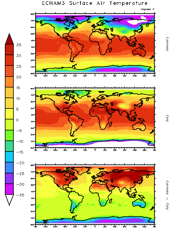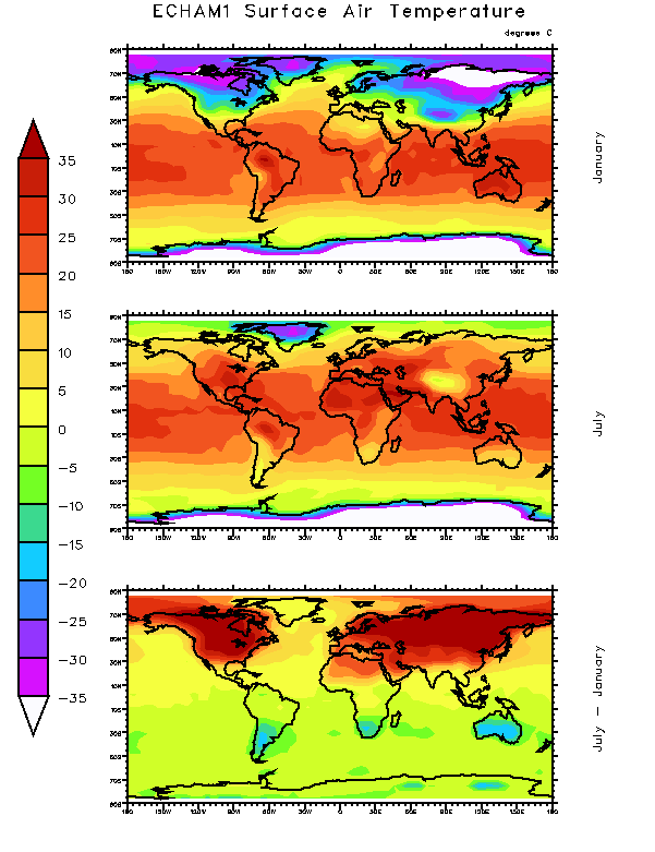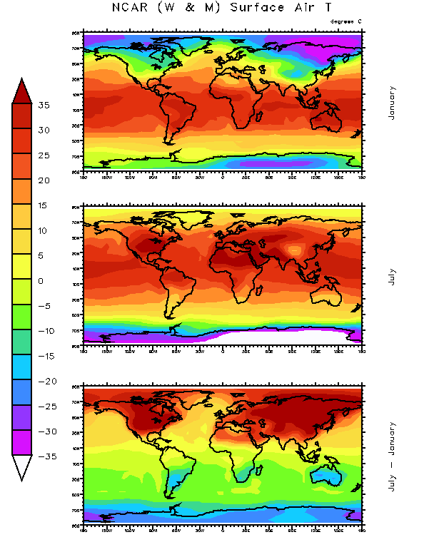 The following links point to graphics displaying climatological mean January, July and (July - January) surface air temperature. This quantity is shown for each of the CMIP1 models and for each of five observed data sets. For a summary and discussion of these results, see the manuscript "The Seasonal Cycle in Coupled Ocean-Atmosphere General Circulation Models" by Covey et al.