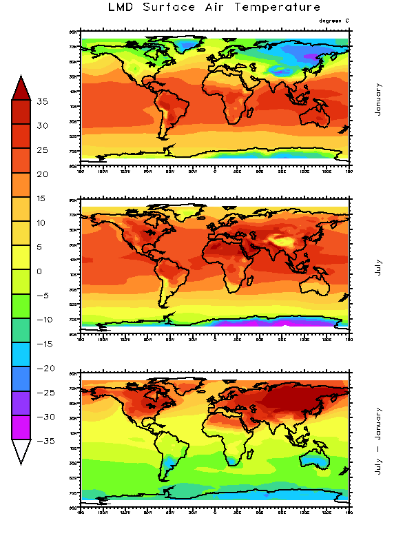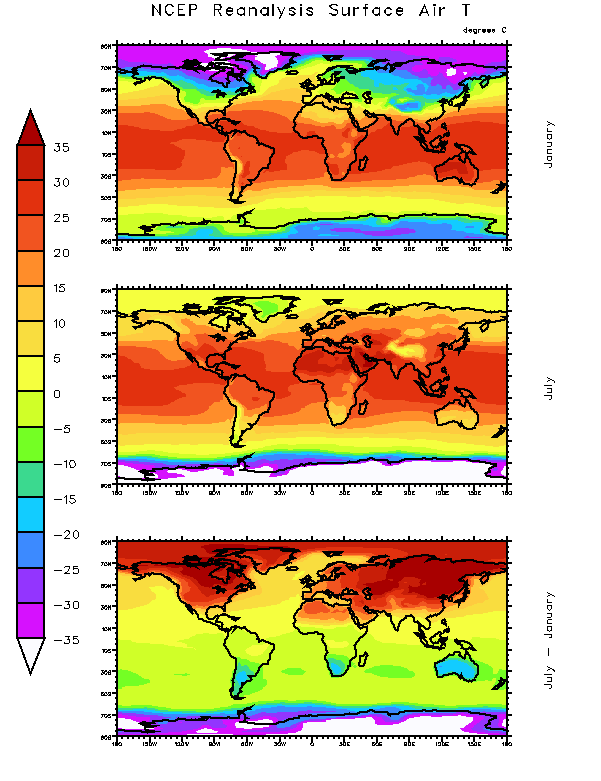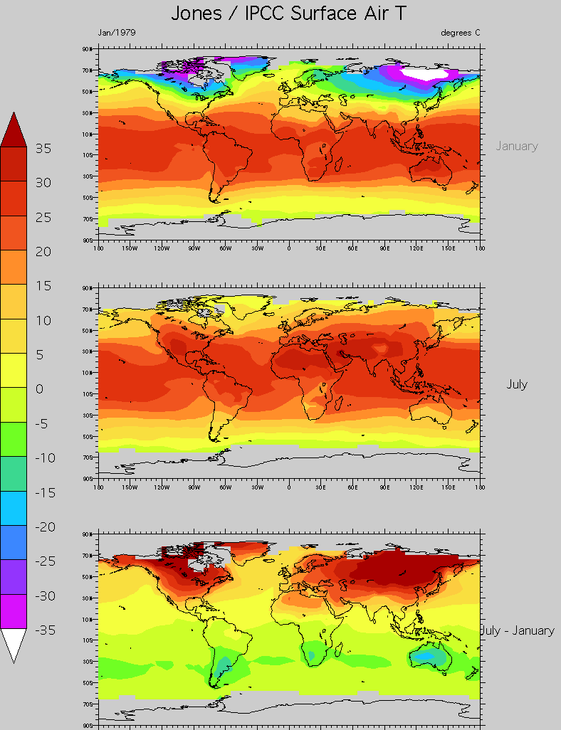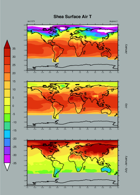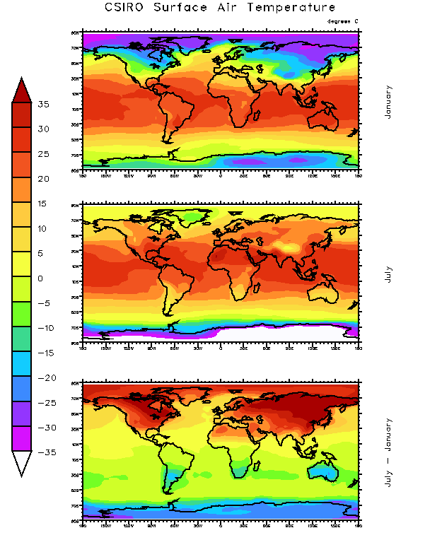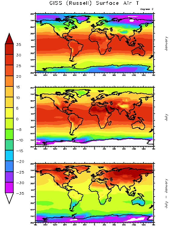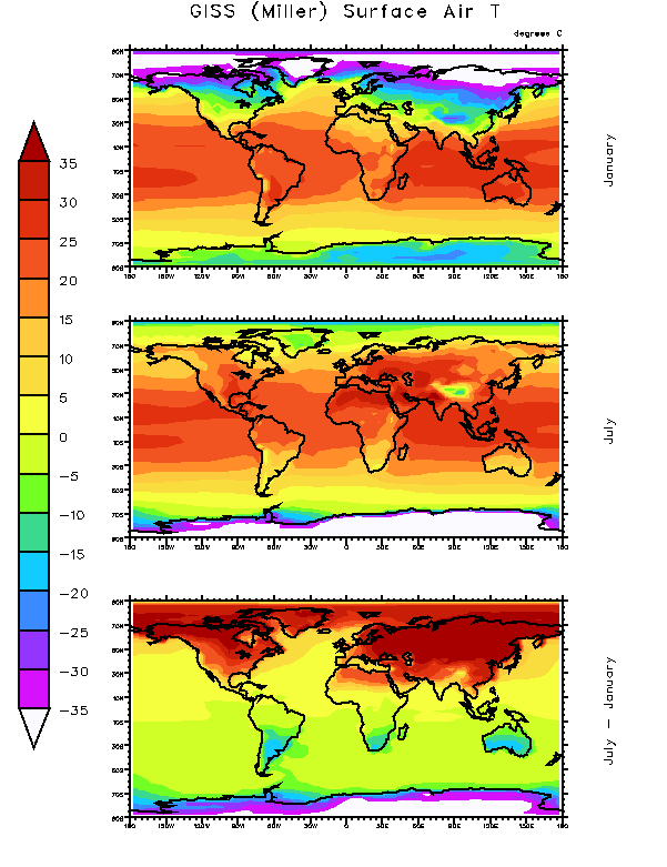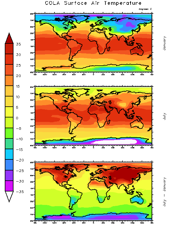 The following links point to graphics displaying climatological mean January, July and (July - January) surface air temperature. This quantity is shown for each of the CMIP1 models and for each of five observed data sets. For a summary and discussion of these results, see the manuscript "The Seasonal Cycle in Coupled Ocean-Atmosphere General Circulation Models" by Covey et al.