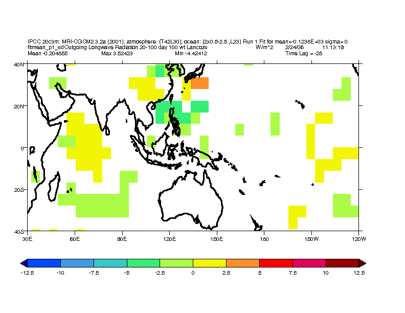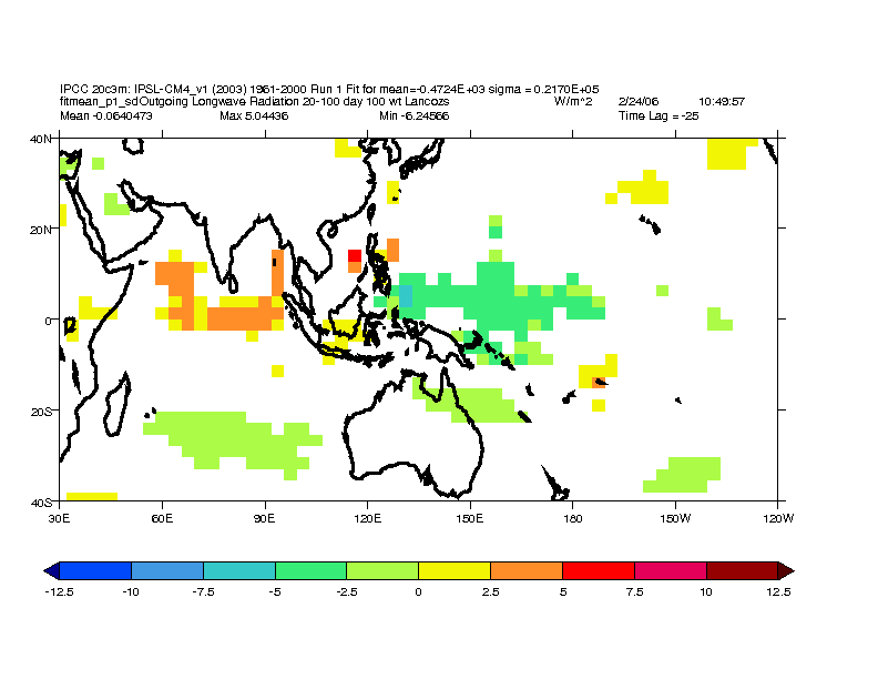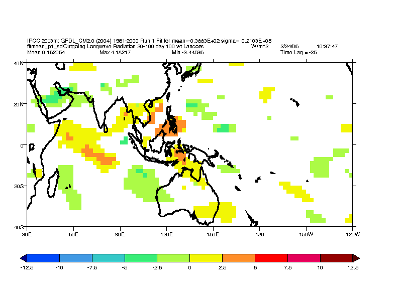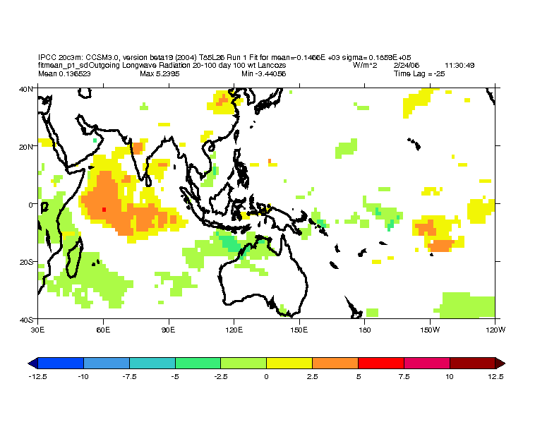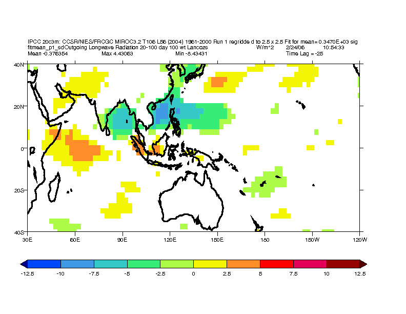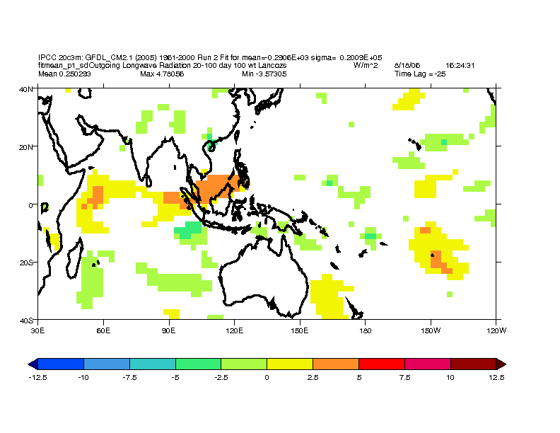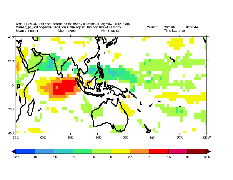 Movies of boreal summer intraseasonal variability based on regression of PC-4 with 20-100 day bandpass filtered outgoing longwave radiation for time lags from -25 to 25 days. The time lag is noted toward the upper-right of the movies. The regressions have been scaled by one standard deviation of the respective PC-4 time series to give units of Wm-2, with negative values corresponding to enhanced convection. Data has only been plotted where significant at the 5% level assuming each pentad is independent.