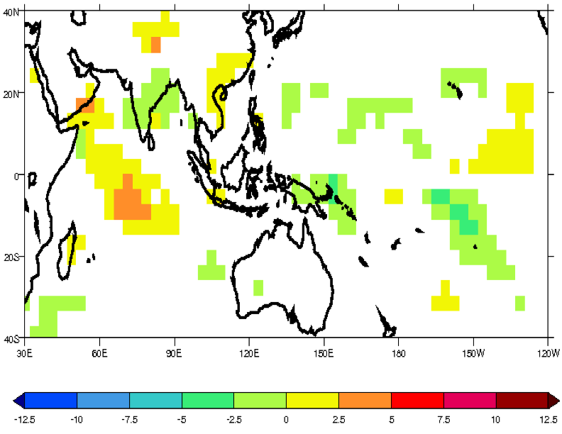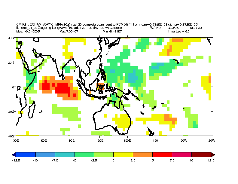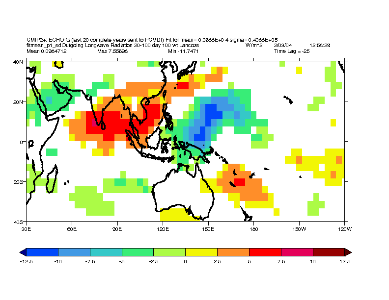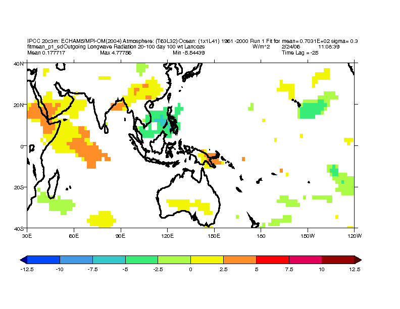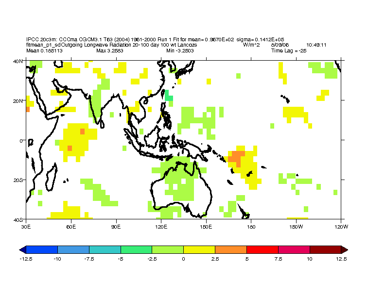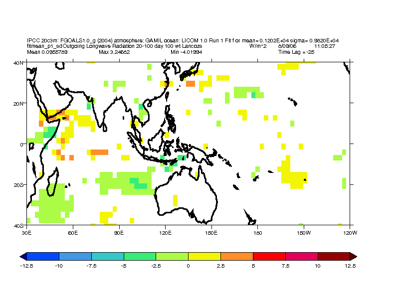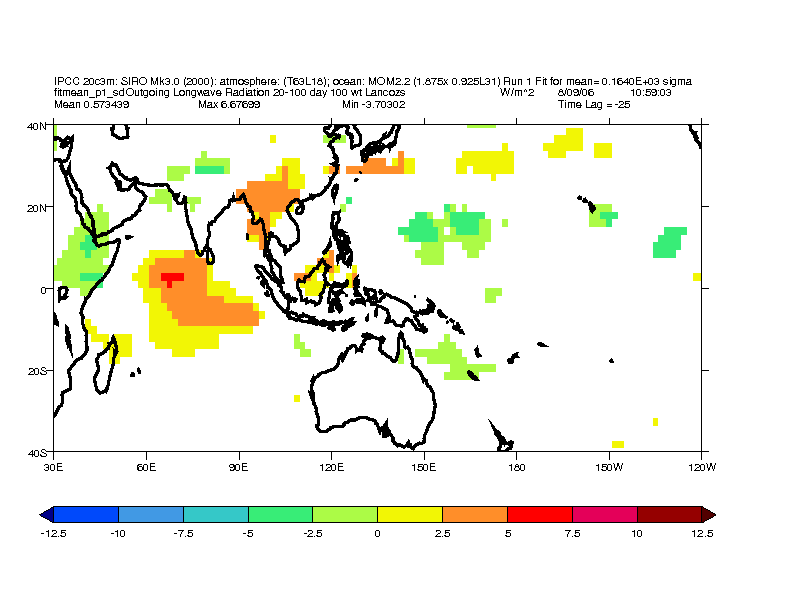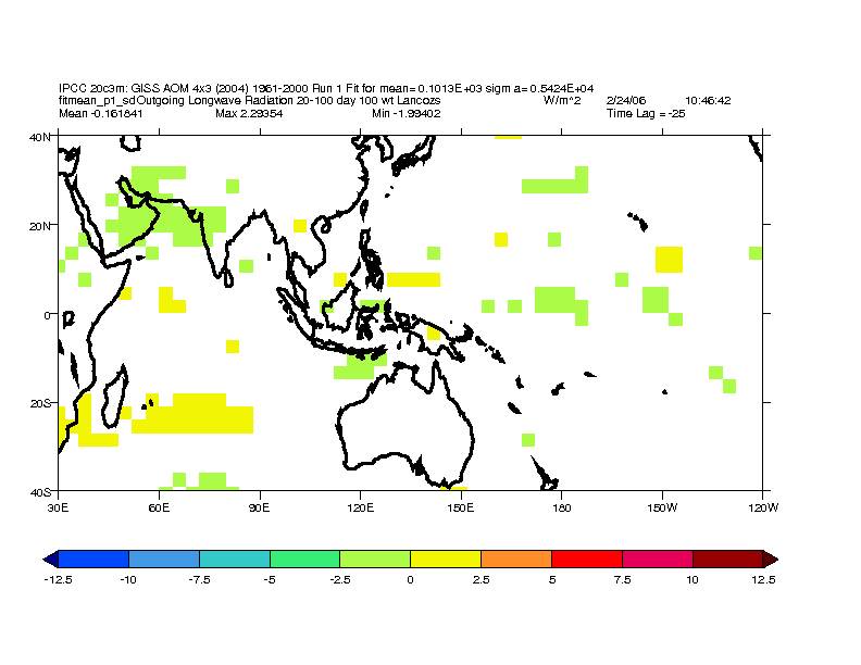 Movies of boreal summer intraseasonal variability based on regression of PC-4 with 20-100 day bandpass filtered outgoing longwave radiation for time lags from -25 to 25 days. The time lag is noted toward the upper-right of the movies. The regressions have been scaled by one standard deviation of the respective PC-4 time series to give units of Wm-2, with negative values corresponding to enhanced convection. Data has only been plotted where significant at the 5% level assuming each pentad is independent.